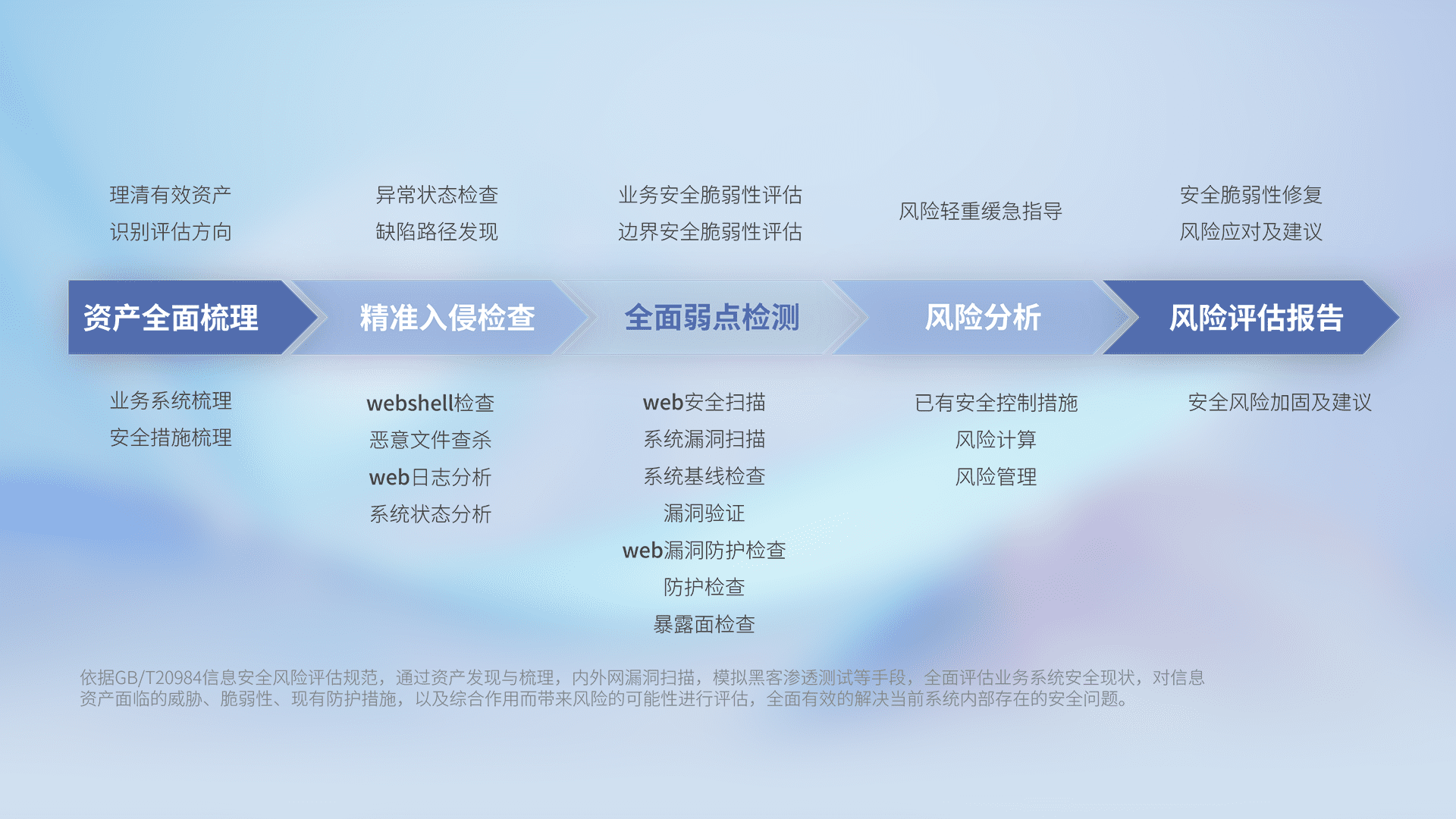 针对客户行业特性,,,以专业的安全服务+多厂商联合解决方案提供专属的一站式安全管理服务,,,,帮助客户全面感知网络空间威胁,,基于识别、、、检测、、分析、、、、防护、、、、监测、、响应的服务理论模型,,,,从方案咨询、、、、集成交付、、评估验证、、优化加固、、、、运维运营,,,致力于为客户提供完整的闭环管理式安全服务。。。。以实战经验为客户打造高抵御风险的安全体系,,帮助客户发现威胁、、、、对抗威胁、、、、处置威胁,,,不断积累安全对抗能力,,持续保障数字化安全。。。